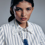 KNTLGY Beaded Tie Necklace – silver chain necklace with blue beaded tie pendant